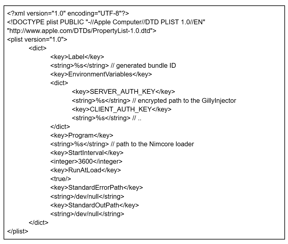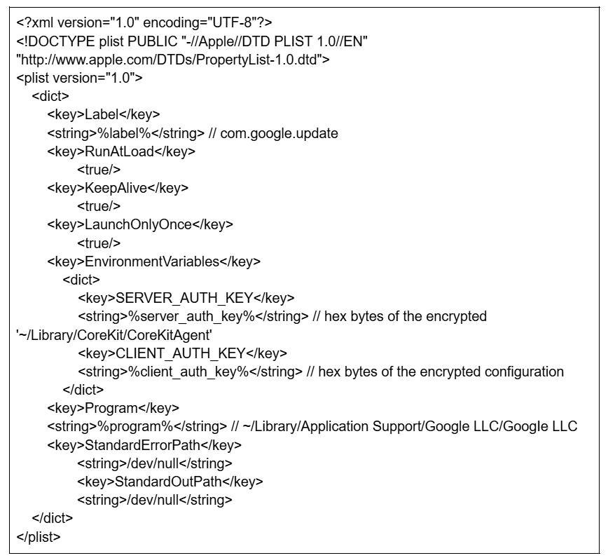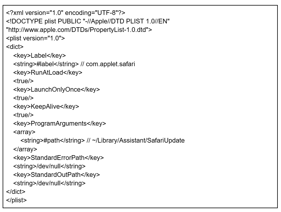 The contents of the plist file are hard-coded into the dropper in base64-encoded form. When decoded, the template represents a standard macOS LaunchAgent plist containing the placeholder tokens #path and #label. The malware replaces these tokens to customize the template. The final plist configuration ensures the launcher automatic execution by setting RunAtLoad to true (starts at login), KeepAlive to true (restarts if terminated), and LaunchOnlyOnce to true.