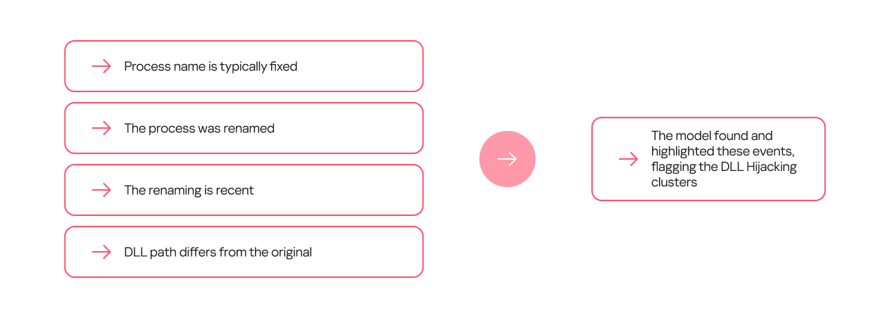 Additionally, we recently deployed a DLL hijacking detection model into the Kaspersky SIEM, but first we tested the model in the Kaspersky MDR service. During the pilot phase, the model helped to detect and prevent a number of DLL hijacking incidents in our clients’ systems. We have written a separate article about how the machine learning model for detecting targeted attacks involving DLL hijacking works in Kaspersky SIEM and the incidents it has identified.