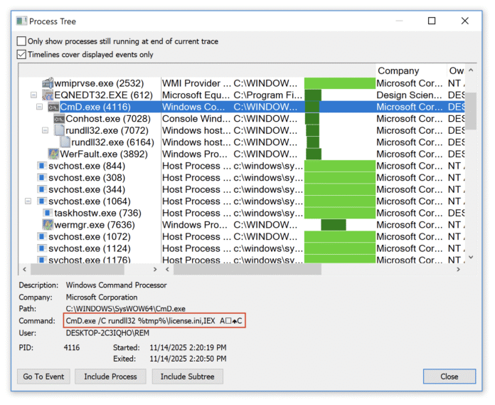 The RTF document contains a shellcode that triggers the Equation Editor exploit. The next payload is C:\Users\user01\AppData\Local\Temp\license.ini. It’s a DLL (SHA256:d8ed658cc3d0314088cf8135399dbba9511e7f117d5ec93e6acc757b43e58dbc) that is invoked with the following function: IEX