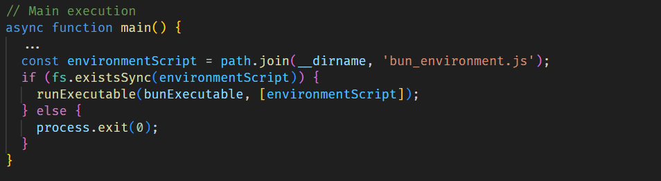 The initial-stage script setup_bun.js is left intentionally unobfuscated and well documented to masquerade as a harmless tool for installing the legitimate Bun JavaScript runtime. It checks common installation paths for Bun and, if the runtime is missing, installs it from an official source in a platform-specific manner. This seemingly routine behavior conceals its true purpose: preparing the execution environment for later stages of the malware.