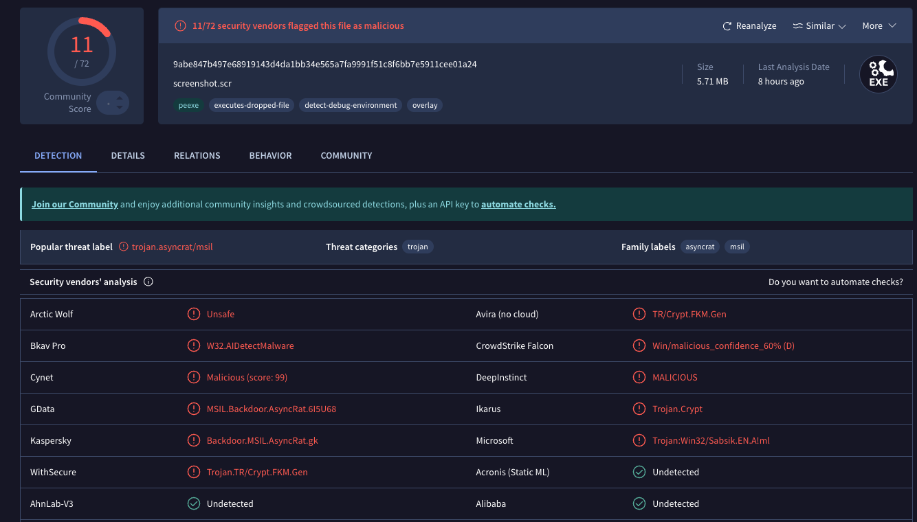 Mandiant’s Austin Larsen said the trojan is a commercially available backdoor known as ASYNCRAT, a .NET-based backdoor that communicates using a custom binary protocol over TCP, and can execute shell commands and download plugins to extend its features.
