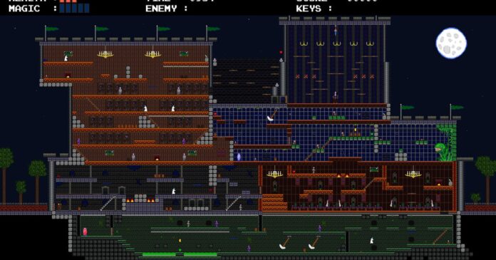 Truth be told, I have never played a Castlevania game. Just haven’t gotten round to one of ’em yet! Symphony of the Night is probably more my speed over the original games, but I do see their importance too of course. However, what I have played, at least a little bit of, is a game that is very derivative of OG platformer except for the fact you can see the entire, 8-bit level at once: Schattenjäger.