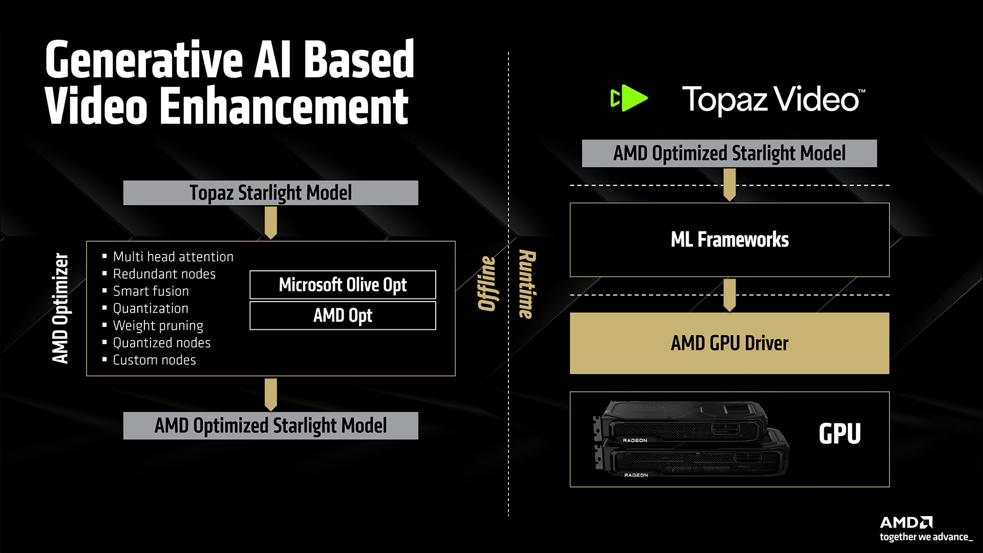 AMD partnered with Topaz Labs to bring these ‘video enhancement’ features mentioned above to client devices accelerated by AMD Radeon GPU technologies for both integrated and discrete graphics platforms. This cutting-edge model went through various optimization and transformation phases through AMD model optimizer tool chains, resulting in up to 3.3x performance improvement and significant memory reduction vs. the base model when running on AMD platforms [1][2].
