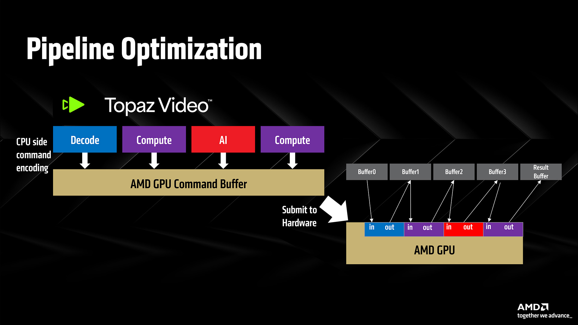 With the release of the AI-powered Topaz Video application, significant optimizations have been introduced across the video decode and AI computation pipeline. These enhancements streamline GPU execution by eliminating redundant memory copies, reducing costly resource interoperations, and minimizing CPU synchronization overhead. As a result, the full video processing pipeline sees substantial improvements in GPU utilization and responsiveness. These advancements will be available in future versions of Topaz Video AI, optimized specifically for AMD Radeon GPUs.