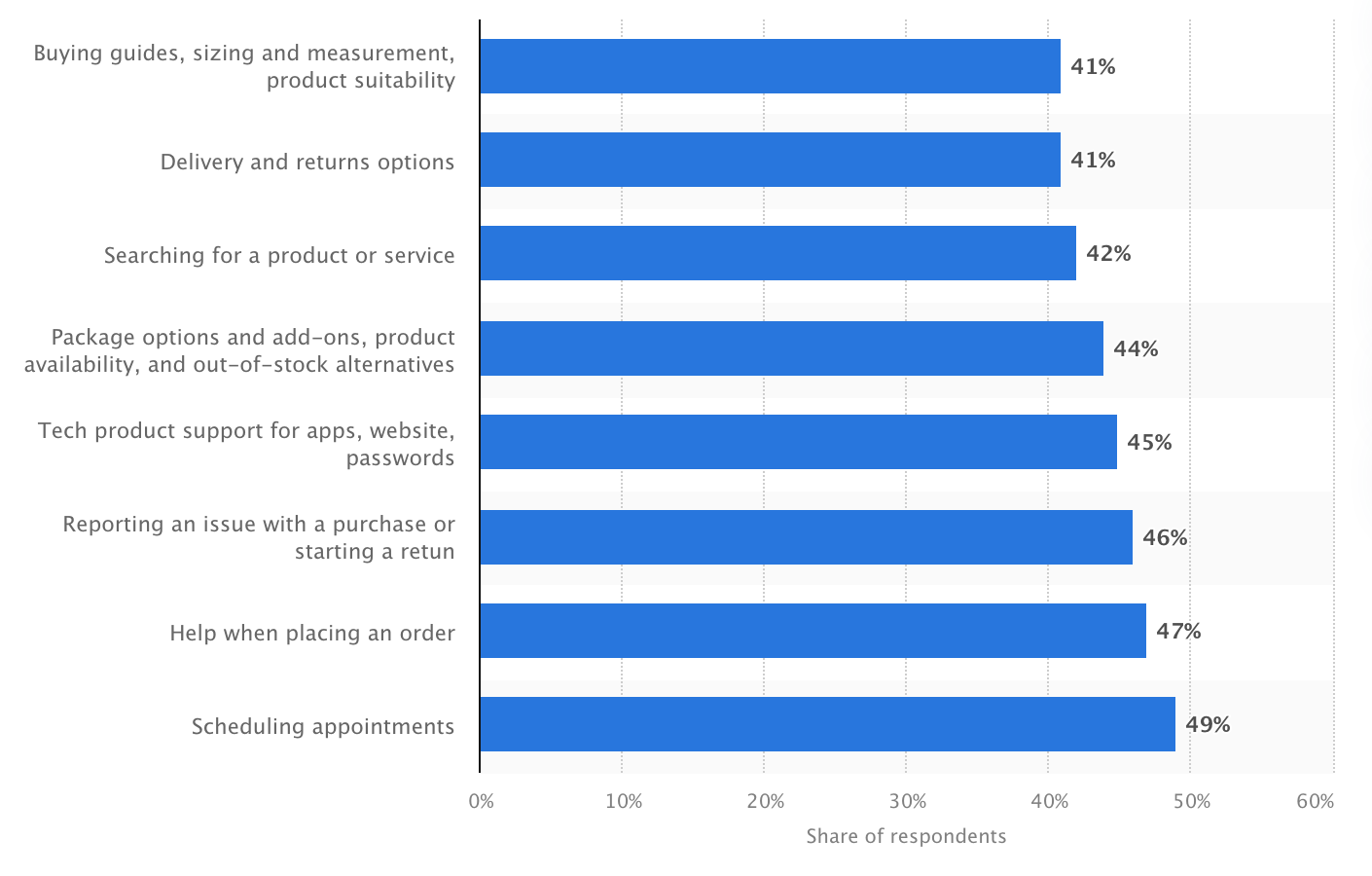 In particular, nearly half of the consumers accessed them when making appointments, 47% when seeking assistance with order fulfillment, and 46% when documenting a problem or initiating a refund.